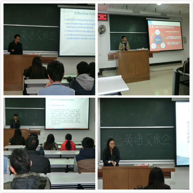 3月18日晚上7:45—9:30,葡京8883官网入口2015级研究生在2205教室举办了以“朋辈帮学,携手并进”为主题的英语学习经验交流会,丁浩、李靖、苏志俊、侯艳雯四位同学担任主讲,葡京8883官网入口2015级部分同学参与,交流会由邢璐璐同学主持。