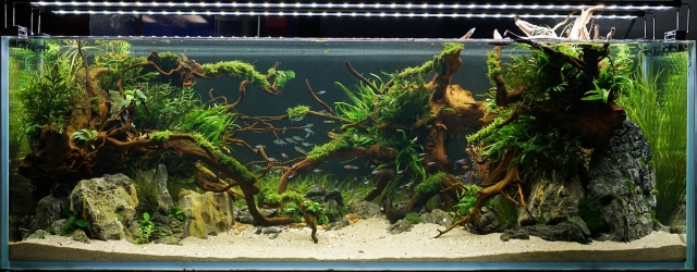 本届赛事赛制与往届不同,各参赛团队需在校内制作实物,网上提交影像作品初评,决赛前往大连参加现场答辩。赛事通知的发出到提交作品只有短短20余天,时间紧、任务重,给各高校参赛团队带来了很大的压力。葡京官网参赛选手梁炳辉、王童、问高生团队在综合考虑硬件资源、作品风格、成景时间等因素的基础上,决定不使用生长周期长的前景草,构建能快速成景的以青龙石和杜鹃根为主体框架的亚马逊丛林风格水景。在两位老师的指导下,经过长达20余天细心的构图、造景、维护和修整工作,该作品不论是整体还是局部都达到了令人满意的状态。