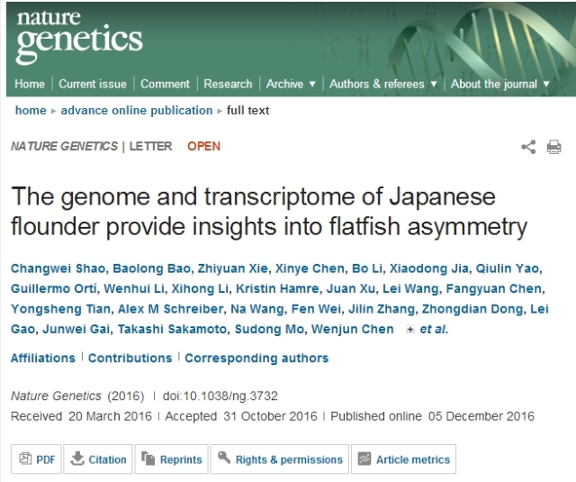 | 《Nature Genetics》发表葡京官网教师与黄海水产研究所等合作的关于褐牙鲆基因组和变态的研究论文 |