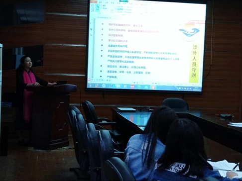随后的动员会上,针对同学们对于即将到来的马来西亚实习生活上的好奇和疑惑,各位老师做了详细的解答,并给了非常具体的建议,希望实习同学心怀祖国,心系学校,放低姿态,降低期望值,更好的适应环境。最后,学院请国际交流处朱章华副处长为实习学生进行了出行前外事教育,从涉外人员守则、涉外工作中的国家安全和保密、境外突发事件和意外情况的应对的处理等多方面进行教育,希望在场同学在外能够牢记领事馆电话,遇到危险及时求助,保障好自身安全,注意言行举止。