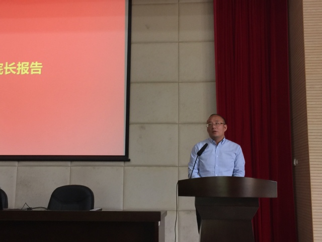 紧接着,院长谭洪新做新学期报告,报告分为6部分内容:1.继续以教育教学改革为抓手,把提高人才培养质量突出其中心地位落到实处;2.继续以国家级项目申报为抓手,提升学院在承接国家重点科研项目的能力;3.继续以暑期教授博士服务团为扎手,做好特色鲜明的社会服务工作;4.大家要凝心聚力做好学科建设工作;5.继续引育并举提高师资队伍水平;6.学院的保障条件建设要提高。谭洪新从这6个方面对新学期的工作做了全面的部署,他强调一流学科建设任务繁重,人人肩上有重担,全院上下要拧成一股绳,劲往一处使,共同推动学院向前发展。