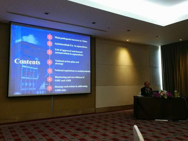 按照本次会议日程,9月4日下午,葡京8883官网入口胡鲲教授作为中国国家专家作了“China Assessment Onamu and AMR in China: AQUACULTURE”的报告。该报告从中国水产养殖的背景、主要病害、政府对抗菌药物监管的职能、水产养殖中允许使用的抗菌药物清单和禁用药物清单、国家对AMU和AMR的行动计划、政府主导的监控(Monitoring)监督(surveillance)行动以及在控制AMR风险方面的措施等内容。由于中国是世界上最大的水产养殖国、消费国及抗菌药物生产使用和销售国,该报告引起了参会代表的广泛关注,并与相关代表就抗菌药物使用及其造成的耐药性问题进行了讨论。