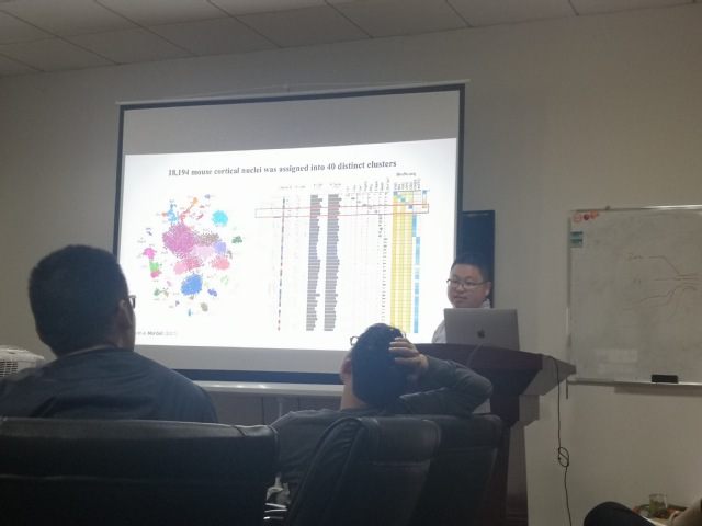 胡鹏博士首先介绍了单细胞测序技术的研究进展以及多种高通量测序技术优缺点,对于一些较难分离完整单细胞悬液的组织或者冷冻样品,单细胞核测序技术有着明显的优势,胡鹏博士通过研发高通量高通量细胞核测序技术(sNucDrop-seq),系统的解析了小鼠大脑中40多种不同的细胞类型,其研究成果发表于cell子刊molecular cell。进一步利用这项技术解析了小鼠心肌症模型中不同细胞类型特异的调控网络,其成果发表于国际知名期刊Genes & Development. 随后介绍了最新正在研究中的新生转录本单细胞标记技术,通过这项技术可以在单细胞水平研究mRNA的代谢动力学。最后,通过展示单细胞测序技术应用于小鼠垂体上研究的例子,为我们揭示了如何通过这项技术来解决实际的生物学问题。引发与会人员的广泛兴趣。葡京8883官网入口相关科研人员和研究生认真听取了报告,并就感兴趣的问题与胡博士展开了热烈的交流和讨论。