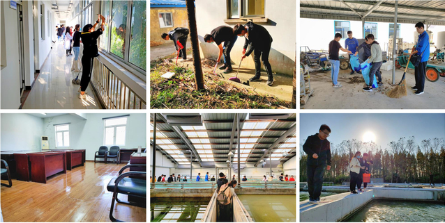 下午14时,党支部全体50余人到达滨海基地内场,在支部书记董绍建和基地指导老师郑国栋的组织下,以小组为单位对养殖场的办公楼、实验室、会议室、车间等进行大扫除,同学们干劲十足,不一会儿就让养殖场的环境焕然一些,同学们还进行了垃圾的分类投放。大扫除完毕后,党支部参观了跑道式多功能循环水养殖实验室、观赏水族实验室、冷藏室、饲料加工实验室等,此外大家在郑国栋带领下对内场中的育种池和大池塘中的鱼进行投喂。通过参观学习,现场实践,同学们对水产养殖的养殖环境、养殖条件、设施、方法等有了初步的认识。