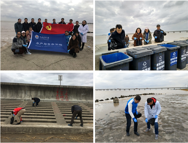 2019年11月29日中午,葡京官网葡京8883官网入口生物联合党支部和水产动物医学系党支部党员在支部书记杨金龙和宋增福带领下,利用中午挤出来的时间,发挥高校党员先锋模范作用,服务临港新片区生态环境,前往东海岸边东海大桥旁的滩涂上开展海滩垃圾清理活动。