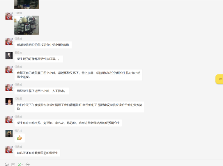 临时党支部组织在校生符策峰、王韶伟、段志鸿三位党员和庞天抒、汤荣康两位入党积极分子定期检查学院各个楼层安全,保证疫情时期学院各个实验室的正常运转。此外,针对学院大规模养殖实验用鱼,值班老师超负荷工作的情况,组织学生党员符策峰、王韶伟、段志鸿以及庞天抒、汤荣康、李向同学帮助老师维护鱼房,保证鱼房的正常运行。临时党支部还代表学院党委对因过年期间返校而被隔离的同学进行问候,王韶伟和庞天抒两位同学更是主动站出来帮忙送生活物资和送饭。葡京8883官网入口留校学生临时党支部用实际行动筑牢抗“疫”防线,为打赢疫情防控阻击战贡献着自己的力量。