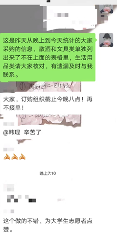 身处湖北省宜昌市的2019级生研2班的韩琨同学因疫情严重无法出门,但冰冷的门窗无法阻挡韩琨同学作为去年刚转正的共产党员的拳拳爱国之情。疫情形势严峻,家家户户村民紧闭大门。村委会为减少人员流动和接触,为村民实行送货上门服务,因此每周都需要统计村民的购物需求,为缓解村干部的工作压力,也为当前的防控工作出一份力,尽一份责。韩琨同学积极报名志愿者,每天为大家统计购物需求信息,汇总好后发至微信群内一一核对,工作细致认真,负责谨慎,得到了大家的一致好评!