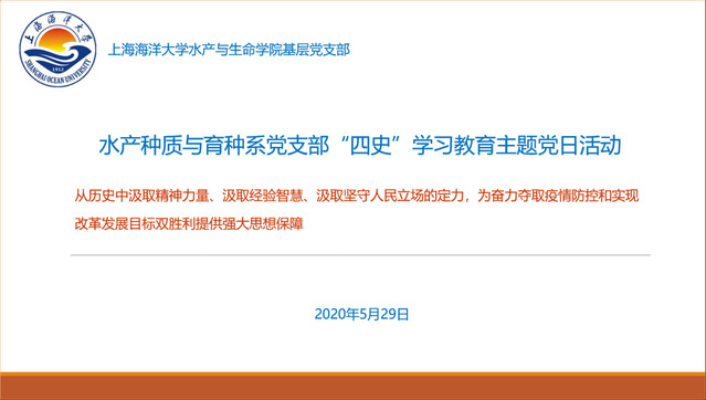 为深入学习贯彻习近平新时代中国特色社会主义思想,教育引导党员进一步增强“四个意识”、坚定“四个自信”、做到“两个维护”,5月29日上午,葡京8883官网入口水产种质与育种系党支部通过腾讯会议开展“四史”学习教育主题党日活动,活动主题为“从历史中汲取精神力量、汲取经验智慧、汲取坚守人民立场的定力,为奋力夺取疫情防控和实现改革发展目标双胜利提供强大思想保障”。