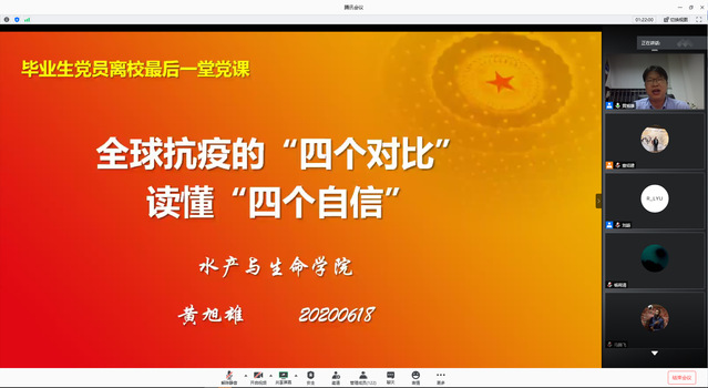 黄旭雄以“从全球抗疫的‘四个对比’读懂‘四个自信’”为主题为毕业生党员上了离校前最后一堂党课。通过疫情在中国得到了有效的控制与其在欧美迅速蔓延的趋势进行详细比较和分析,进一步展现了中国共产党领导的优势,强化了学生党员“四个意识”和“四个自信”,他同时寄语各位毕业生党员要时刻牢记“勤朴忠实”的校训,牢记自身党员身份,端正态度,勤勉工作,在社会工作中继续发扬艰苦奋斗和担当精神,展现人生价值。