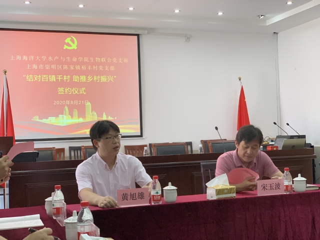 会议由黄旭雄书记主持。裕丰村党支部书记杨凯和生物联合党支部书记杨金龙分别介绍了裕丰村和葡京8883官网入口和生物联合党支部的党建工作。宋玉波镇长介绍了裕丰村近期发展建设方面的需求,并对本次支部共建提出了期望,希望能够发挥葡京8883官网入口的专业技术优势,聚焦生态文明建设需求和乡村振兴的内涵,把裕丰村作为科学技术和发展理念转化的试验田。黄旭雄对宋镇长的期望做出了积极回应,号召生物联合党支部的相关教授团队积极参与裕丰村的河道治理和产业升级。通过双方党支部共建,以党建为统领,以业务为着力点,推进党建工作和业务工作融合创新,为裕丰村、为崇明生态岛建设作出葡京8883官网入口的贡献。随后生物联合党支部和裕丰村党支部签订了支部共建协议书。