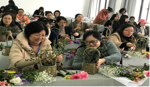在老师的指导下,大家根据手中花材种类及特点,按照各自的审美情趣,从鲜花的取材、剪叶、布局开始,打造美丽花篮。大家边看边学边讨论,享受着插花艺术带来的快乐。经过两个多小时的亲手实践,一盆盆生意盎然,创意十足的插花作品呈现在大家眼前。