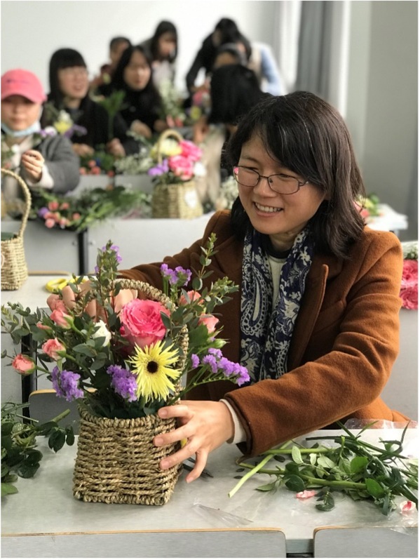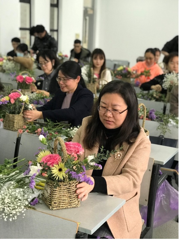 为让女教职工们创造出造型优美、意义独特的插花作品,本次活动邀请了专业机构的插花师进行现场指导。活动分为插花讲座和插花体验两个部分。插花师黄老师首先将本次插花所用到的花品一一进行介绍。接着,她细致讲解插花的每一个步骤所用到的基本知识及技巧。在这个过程中,女教职工们也跟着老师讲解的步骤,进行插花体验。