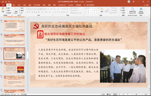 第十三章部分为促进人与自然和谐共生,领读人是余欣欣和杨晗同志。众所周知,良好的生态文明环境与增强民生福祉间有着密切的关系,良好的生态环境是人类生产与健康的基础。人类生存离不开生态环境,用之不觉,失之难在。人类在经历了原始文明、农业文明、工业文明后,生态文明成为人与自然和谐发展的新要求。从历史经验教训看,生态兴则文明兴,生态衰则文明衰。