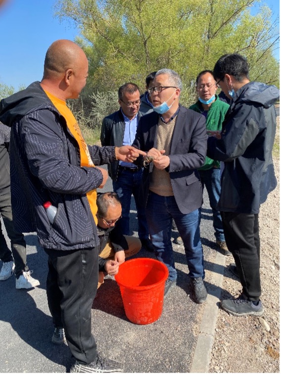 在察布查尔县悦然生态农业有限公司,成永旭一行对当地大闸蟹养殖情况进行调研,与经营主体进行深入技术交流,针对新疆高寒地区大闸蟹养殖遇到的关键问题作出具体技术指导,提出针对性意见。
