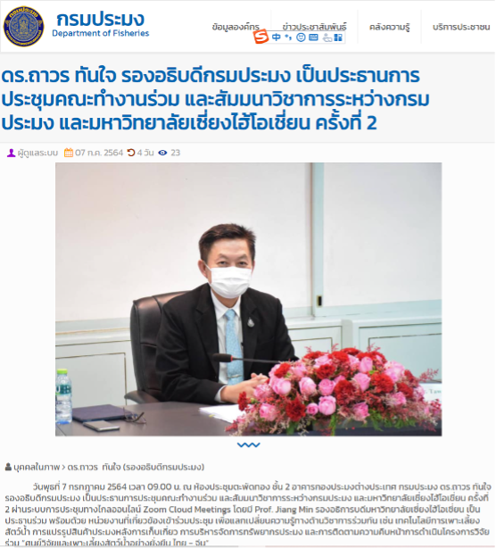 2021年7月7日星期三上午9:00,渔业司国际处大楼2楼金龙鱼会议室,渔业司副司长Taworn Thunjai与葡京8883官网入口副校长江敏通过线上会议系统Zoom Cloud共同主持第二届泰国渔业司与葡京8883官网入口联合研讨会暨工作会议。相关机构一并出席此次会议,进行学术知识交流。例如水产养殖技术、水产产品的收获后加工、渔业资源管理,并跟进联合研究项目 “泰中可持续水产养殖研究和推广中心”的进展。