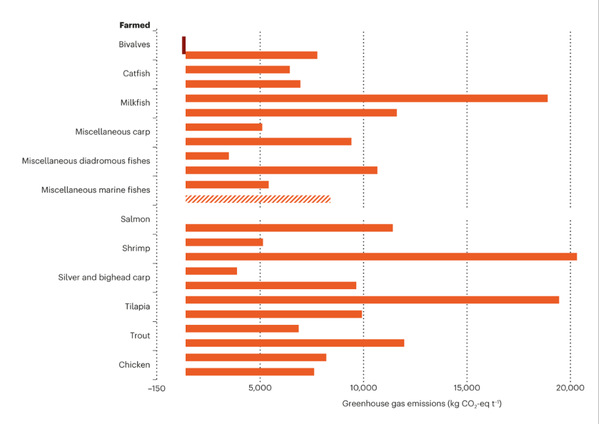 研究表明,海藻和养殖的双壳类动物,如贻贝和牡蛎,产生的温室气体和营养物质氮磷排放最少,占用的土地和消耗的淡水资源也最少。捕捞渔业也导致很少的营养物质排放,并使用有限的土地和淡水资源,但与养殖鱼类相比,不同的捕捞渔业温室气体排放差异显著,例如沙丁鱼和鳕鱼捕捞渔业温室气体排放相对较低,而比目鱼和龙虾捕捞渔业温室气体排放相对较高。