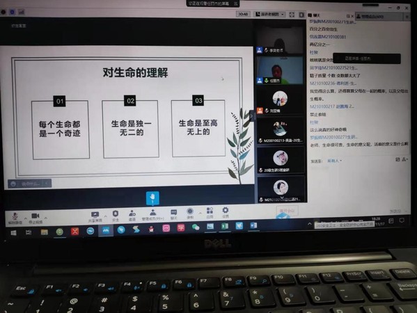 讲座中穿插着感人的视频、体验活动、讨论分享等,有多次师生互动,学生在讲座后的提问答疑环节也非常踊跃,整场讲座氛围温暖而坦诚。学生们纷纷在腾讯视频聊天区打字表示:老师讲得真好,谢谢老师。