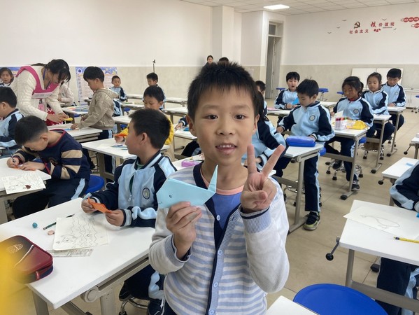 课堂上授课团队带领小朋友们学习了蓝鲸的生物学特征、食性等,并与前期课堂讲述的座头鲸加以对比,寻找相似与不同。讲课过程中,授课团队通过活泼生动的话剧表演方式演绎了一场蓝鲸捕食短剧,点燃了课堂气氛,让小朋友们对蓝鲸捕食方式、捕食对象等知识留下了深刻的印象。“鲸落”现象也让小朋友们产生了浓厚的兴趣,在了解和学习过后,小朋友们对环境生态学及与海洋生物生息相关的知识有了更多的思考。课堂提问环节中,小朋友们竞相举手发言,纷纷表示要从自身做起,爱护海洋动物的家园。最后,同学们通过蓝鲸绘画和折纸的方式绘制出自己心中的蓝鲸,课堂上趣味性十足。