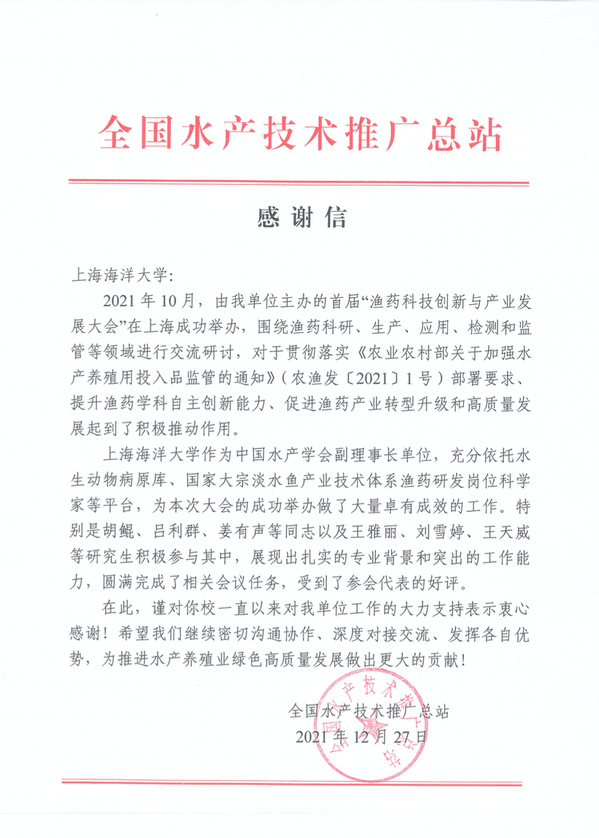 近日,学校收到全国水产技术推广总站发来的两封感谢信。其一对葡京8883官网入口竹攸汀同志在水产技术推广总站挂职期间做出的贡献予以感谢和表扬;其二对葡京8883官网入口胡鲲、吕利群、姜有声等同志以及王雅丽、刘雪婷、王天威等研究生在首届“渔药科技创新与产业发展大会”中做出的贡献予以感谢和表扬。