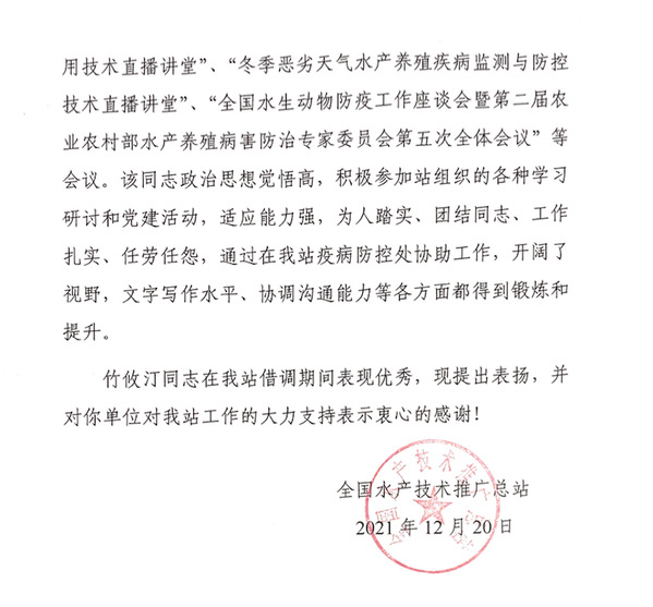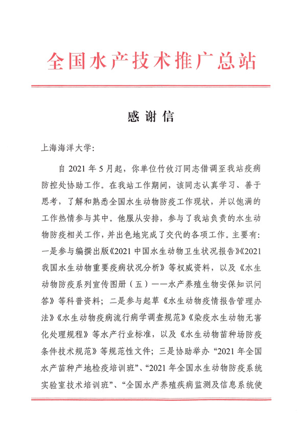 自2021年5月起,葡京8883官网入口教师竹攸汀借调至全国水产技术推广总站疫病防控处协助工作,全国水产技术推广总站在信中对葡京8883官网入口给予的大力支持和帮助表示衷心感谢,并对竹攸汀借调期间的工作表现给予了高度评价。葡京8883官网入口一直秉承“勤朴忠实”的校训,在不断加强师资队伍和梯队建设的同时,也一直助力新农科的建设和发展。竹攸汀主要从事海洋贝类与环境互作关系、海洋贝类变态机制的研究,他熟悉全国水生动物防疫工作现状,以饱满的工作热情投入到全国水产技术推广总站负责的水生动物防疫相关工作中,并出色地完成了各项工作。