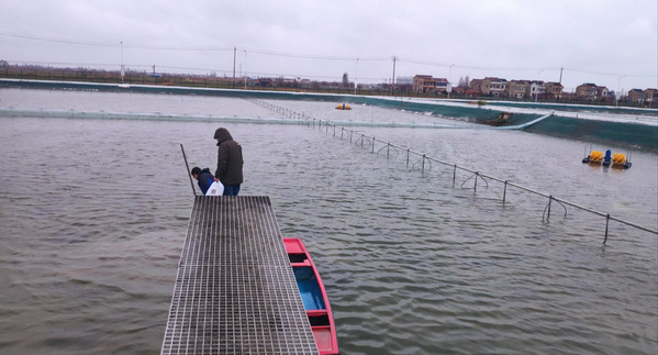 科研人员在金坛养殖基地冒雨采样