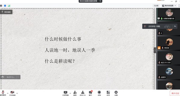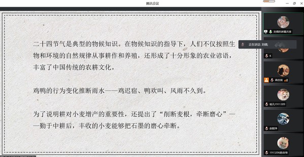 同学们在课堂上围绕耕读文化和专业学习展开了热烈讨论。杜宇同学的科研方向与海带有关,他认为农业与耕读是存在结合点的,海带的养殖需要掌控天气变化,也需要结合“二十四节气”的知识去进行养殖。我们需要用自己的所学,去教会渔民们种植海带,用自己的力量为农业的发展,做出一份努力。杨凡同学表示耕读文化的传承是非常必要的,传承和弘扬耕读文化,不仅可以提高自身修养,还可以使同学们增加专业知识,增强传统文化自信。