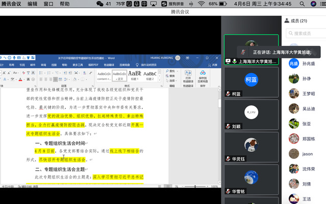 4月6日,葡京8883官网入口党委理论学习中心组在线上召开会议,深入学习贯彻党中央关于疫情防控重要指示精神,学习孙春兰副总理关于上海近期疫情防控工作的讲话精神、李强书记在3月30日上海市领导干部大会讲话精神等,并进行近期工作部署。学院全体党委委员、党支部书记及专职组织员宣传员出席了会议。