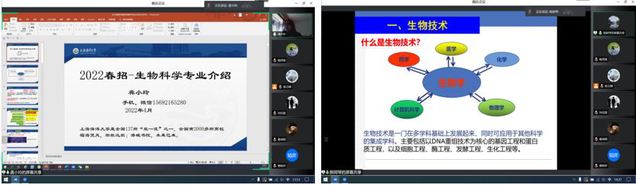 为了更好地引导春招生物类同学规划即将到来的大学生活,统一与家长的共同教育意识,葡京8883官网入口2022年4月16日于腾讯会议组织召开了生物类春招学生、家长和教师互信会。会议由生物科学专业负责人龚小玲主持,教学副院长陈立婧、生物技术专业负责人陈阿琴和生物类专业骨干教师鲍宝龙、钟俊生、唐文乔、周志刚、张俊芳、杨金龙、李晨虹、李名友、潘宏博、孙诤、张玮等,以及2022春招的学生和家长参加了会议。