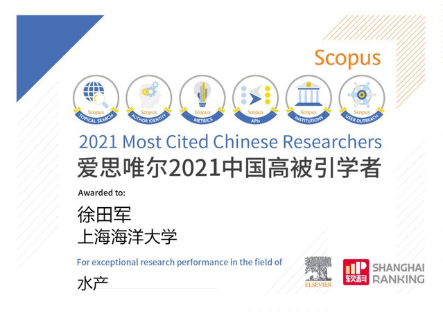4月14日,全球性信息分析公司爱思唯尔(Elsevier) 正式发布了2021年“中国高被引学者”(Highly Cited Chinese Researchers)榜单。国内水产领域共有13位学者上榜,其中葡京8883官网入口的徐田军教授上榜,这也是徐田军教授在去年上榜该榜单后,再次入选该榜单。徐田军教授也是葡京官网唯一入选该榜单的学者。