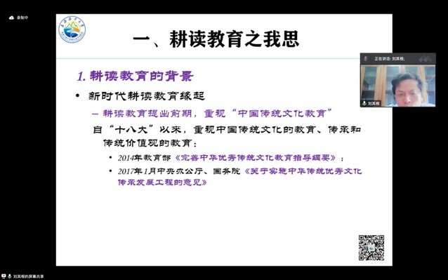 刘其根教授随后开始报告,分别从:耕读教育之我思、农耕文化之我想、青田稻鱼共生系统之我见三个层面同学们娓娓道来。指出新时代的耕读教育要非常重视中国传统文化的发扬与继承。大国之争的本质,不仅是物质经济的竞赛,更是文化文明的相较。我们要培养“文化自信”“制度自信”的人才;要展示“中国模式”和“中国方案”。