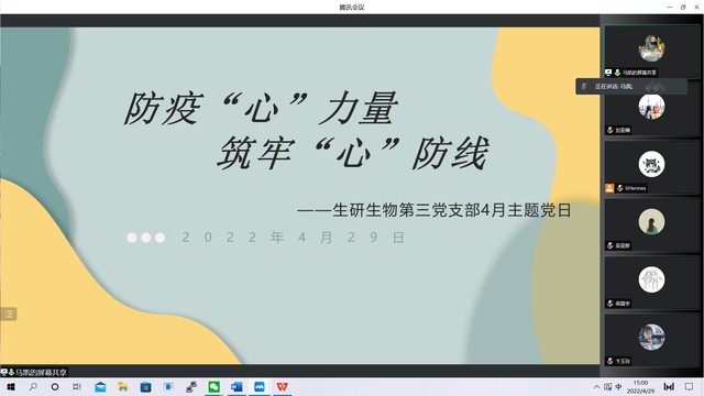 在学校疫情管控下,奉行“足不出户”政策,生研生物第三党支部于4月29日下午开展以“防疫“心”力量 筑牢“心”防线”主题党日,旨在为全体党员带来一场温馨、充满力量的情感交流。