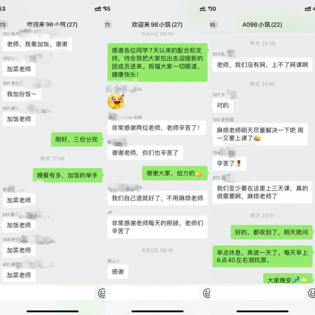 在第十一学生社区区委书记和区长的指导下,柯蓝不仅在工作中从严规范隔离、消杀和转运流程,而且细致入微将对学生们的关爱落到每一个细节,安定同学们的紧张情绪,给隔离楼的每一位同学带来回家般的温暖。她在微信群里对同学们的问题做到有问必答,有难必解,及时了解学生需求,尽力给予保障。看着同学们从刚入住时的透露着紧张不安的各种小问题,到快结束隔离时发自内心对老师们表达的感谢之词,她感到无比欣慰。她认为自己的坚守换来同学们的理解、支持和安全,一切辛苦都值得。正是每位党员都永葆发光螺丝钉的坚韧,充满干劲的牢牢拧在人民最需要的地方,才能为疫情防控攻坚战的胜利打下坚实基础。