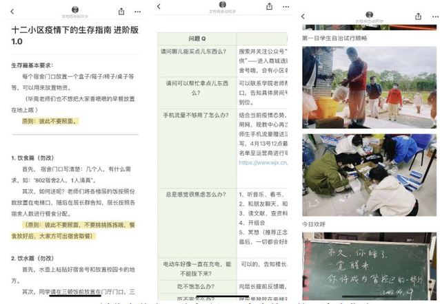 4月11日,刘倩得知小区内存在情绪焦虑的学生。凭借多年辅导员的工作经验,她开启了十二小区“共享生活”,通过搭建共享平台,信息透明良性互动。她依托线上文档,搭建十二小区疫情下的生存指南,从初级1.0版到进阶版1.0,从学校全封控管理到小区开启管控与封控双结合的管理下,线上文档不断升级,文档除了12小区管控下的生活模式外,还包含了美好生活共享部分,截止4月29日,文档上线18天,累计上传图片近300张,累计浏览千余次。有位学生看完文档后说到:“原来每个小区的生活都差不多,我反而感觉踏实多了。”