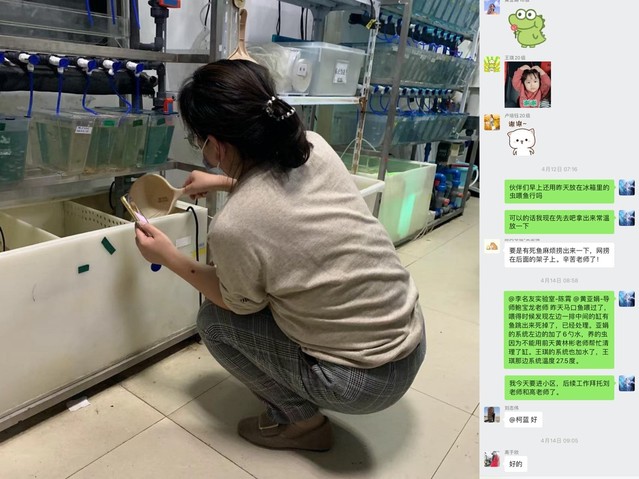 在学校启动准封闭管理后,葡京8883官网入口专职组织员、专职宣传员柯蓝将两个年幼的孩子委托给年迈的父母看护,毅然申请驻校工作。进校之初,由于学生社区封控,在校老师人手紧缺,柯蓝和刘志伟、黄林彬、高于欣等几位老师一起每日定时为研究生喂养科研用鱼。文科出身的她没有任何生物学知识基础,在其他驻校老师帮助下,她快速认真地学习收卤虫、给鱼苗换缸、循环水系统维护等专业知识,并每天与学生隔着手机屏幕视频进行喂鱼工作。柯蓝不断克服困难,打理着3个实验室的3套水循环系统共100多个鱼缸,她精心维护着同学们入学两年来辛苦攒下的科研“活数据”,为的是让被封控在宿舍的同学们安心、放心。