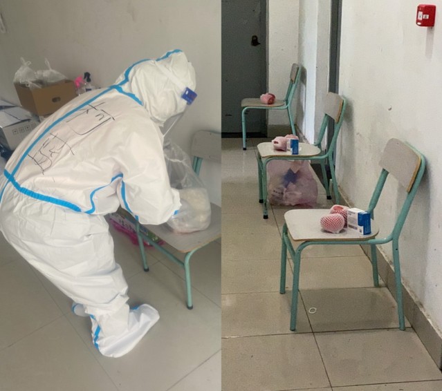 隔离楼栋每隔7天就要进行一次学生入住和转运工作。每当有学生要入住楼栋,柯蓝都提前做好名牌,对应贴在每个宿舍门上,便于更好地开展送餐、送物资、测抗原和上门核酸等工作;提前建立好学生微信群,了解学生诉求,并在区内其他老师帮助下,将同学们的生活必需品放进宿舍。按照学校疫情防控要求,入驻隔离楼栋的学生足不出户,无接触配餐,每日餐食和其他物资由老师送上门。柯蓝身着防护服,每日爬六楼十几趟为同学们送三餐、饮用水和其他物资,一送就是二十天。有时她抱着物资一边上楼,汗水顺着额头滑到眼角一滴滴落下,眼镜和防护面罩被湿气晕染得模糊不清,只能用随身携带的酒精喷壶喷洒面部,驱散雾气继续工作;有时因多次往返高楼层,心跳加快呼吸困难,而她仅站在楼梯上停留几秒大口喘息几次,便继续工作,为的是尽快将热乎乎的饭菜送到同学们宿舍门口。每晚她严格按照要求回收隔离楼栋所有垃圾装入医疗垃圾袋,消杀后用捆扎绳封死运送到指定回收地点。每次工作完毕脱下防护服,她已经汗得浑身透湿。二十天以来,她努力保障了三批次共计78名学生顺利结束隔离,返回原宿舍。