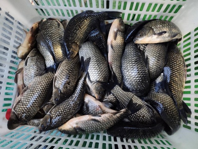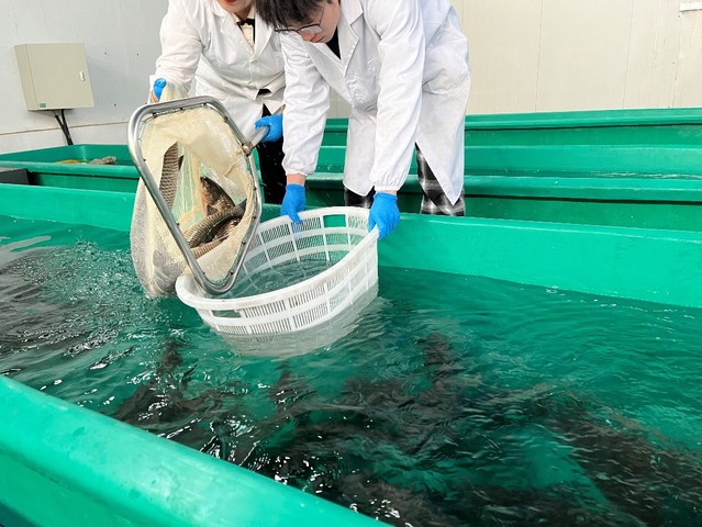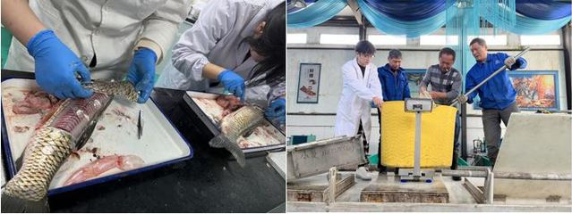 同学们在进行草鱼采样实验 罗雪能同学与工作人员在卸鱼