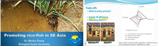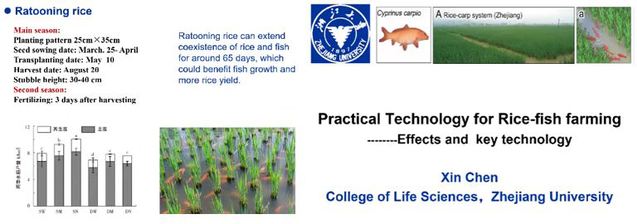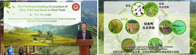 贵州大学姚俊杰教授在会上分享了贵州稻鱼鸭一体化生态系统的建设成果,这种以鸭食虫、以鱼食草、用鸭鱼肥做肥料的稻鱼鸭复合系统具有保护生物多样性,控制病虫害、调节气候、涵养水源等多种生态功能,是一种切实可行的可持续水产养殖生态系统。