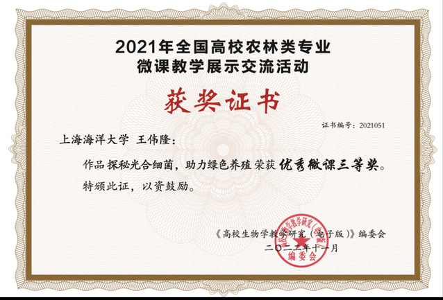 近日,高等教育出版社下发《关于2021年全国高校农林类专业微课教学展示交流活动的通知》,葡京8883官网入口青年教师王伟隆(参赛作品“探秘光合细菌,助力绿色养殖”)荣获三等奖。