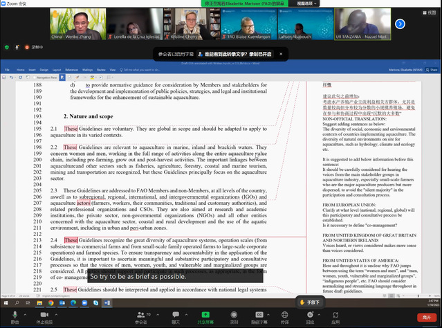 1月9日-11日,由联合国粮食及农业组织(FAO)主办的《可持续水产养殖准则草案》(Draft Guidelines for Sustainable Aquaculture, GSA)(以下简称“《草案》”)审议工作组政府间会议以线上形式举行,来自于44个联合国成员国70余位代表参加了此次会议。受农业农村部渔业渔政管理局指派,葡京8883官网入口张文博副教授代表中国参会。本次会议主席由墨西哥代表担任,会议选举中国、美国、德国、阿曼和坦桑尼亚为副主席国,张文博副教授代表中国参加主席团工作组会议。