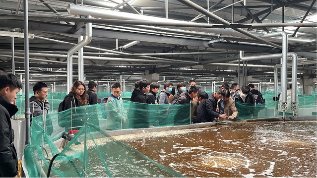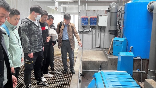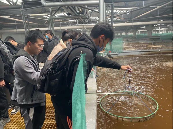 在企业人员和学院老师的带领下,毕业生们参观了公司在建和已建成的现代化养殖车间。通过工作人员的介绍,大家对企业的养殖模式有了进一步的认识和了解。黄旭雄在参观期间,细致观察虾苗的个头、虾壳颜色和养殖环境,提出针对性地技术指导,也给毕业生们讲解了企业中相关设施的使用方法和作用。