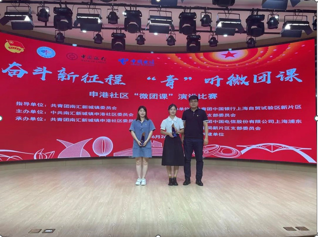 为深入学习贯彻习近平新时代中国特色社会主义思想,使青年学子更加坚定“听党话,跟党走”的信念,加强社区青年的组织建设和思想建设,6月26日,申港社区团委联合中国银行上海自贸试验区新片区分行团支部、中国电信股份有限公司上海浦东电信局新片区团支部等共建单位组织开展“奋进新征程·‘青’听微团课”演讲比赛。