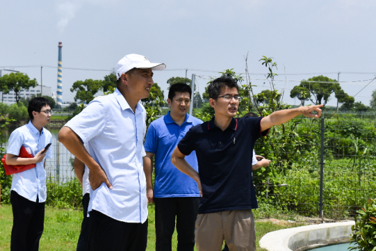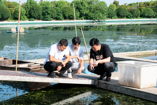 服务团成员在常州淞禄农水公司生态池塘中进行采样和观察
