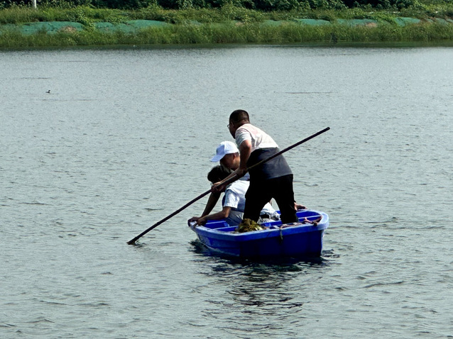 26日下午,服务团队来到安徽腾飞生态农业公司扣蟹养殖池塘进行调研,发现部分池塘划蝽数量很多,服务团成员和腾飞生态农业公司叶总讨论后给出了三种解决方案;随后,服务团来到宣城市金水源食品有限公司参观,该公司主要从事蟹黄和蟹油的加工,原料主要为一龄早熟蟹,腾飞生态农业公司韩总介绍该公司目前碰到的主要问题为加工副产物蟹壳处理费用较高,没有合适的方法进行资源化利用,服务团吴旭干和杨志刚教授仔细询问了加工后蟹壳的物理参数和每日数量等,给出了两种作为饲料原料在虾蟹饲料上的应用方案。最后,服务团来到位于水阳镇的金新河蟹苗种专业合作社进行调研和指导,该基地同时也是安徽农业大学特种水产试验站,该基地常年有安徽农大研究生驻点开展相关研究工作,合作社葛总首先介绍了合作社的基本情况,安徽农大李西雷副教授介绍了该基地今年开展的相关实验情况。服务团到合作社塘口察看和交流,详细了解了当前扣蟹养殖管理情况、投喂饵料和水花生管理,并就水花生控制方法展开了讨论;冯建彬副教授就安徽农大和金星合作社合作开展的河蟹良种选育给出了自己的看法。此外,服务团还实地考察了金新合作社500亩的大水面生态渔业,他们通过投螺和种草恢复大水面生态环境,投放少量河蟹苗种和花白鲢,每年7月份开始出售水草和螺蛳获得了较好的经济效益,这种大水面生态渔业模式已经在皖南地区进行大面积推广。