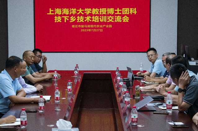 7月27日下午,服务团驱车前往宿迁骆马湖现代农业产业园,宿迁市湖滨新区党工委委员王信海、宿迁市骆马湖水产集团总经理朱苏州和发展部部长葛永春等接待了教授博士服务团一行,双方首先在霸王蟹产业研究院会议室进行了座谈和培训,骆马湖现代农业产业园内的主要河蟹养殖企业和示范户均参加了座谈和培训,吴旭干和张俊分别进行了《河蟹公母分养关键技术及应用》和《智慧水产场景建设及应用》的培训,并与养殖户及技术人员进行了互动。随后,服务团参观了霸王蟹产业发展研究院实验室、展示厅、学生宿舍、实验池塘和包装车间等,并同葡京8883官网入口驻研究院的研究生进行了交流;最后,服务团在王信海和葛永春的带领下前往产业园内的扣蟹和成蟹养殖池塘进行技术服务和交流,服务团就水草管理、稻蟹共生、公母分养和大规格蟹种培育等进行了现场讲解和讨论。霸王蟹产业研究院的科研条件、蟹文化科普和霸王蟹品牌推广给服务团留下了深刻的印象,如何通过科技赋能和三产融合推动河蟹产业高质量发展是值得服务团和河蟹产业界共同努力的方向。