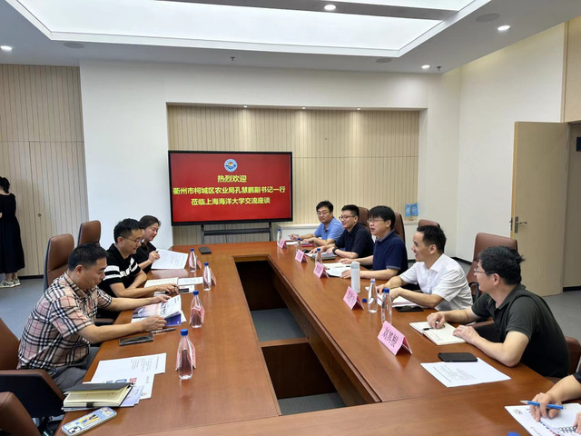 9月14日, 衢州市柯城区农业农村局党委副书记孔慧鹏、副局长童文峰、 区农业农村局计划财资科科长周晓红、柯城区驻上海招商局干部姜含蔑,葡京8883官网入口常务副院长黄旭雄、 副院长王浩、刘其根教授、华雪铭教授、胡忠军副教授、孙云飞博士、孙佳敏博士以及海洋文化与法律学院副院长郑建明等参加调研和座谈交流,黄旭雄主持座谈会。