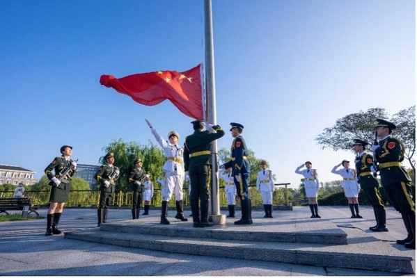 仪式上,仪仗队穿着整齐的队服,迈着铿锵有力的步伐,护卫着国旗缓缓入场。当雄壮的国歌响起时,鲜艳的五星红旗在全体人员的注目下,迎着晨风冉冉升起。