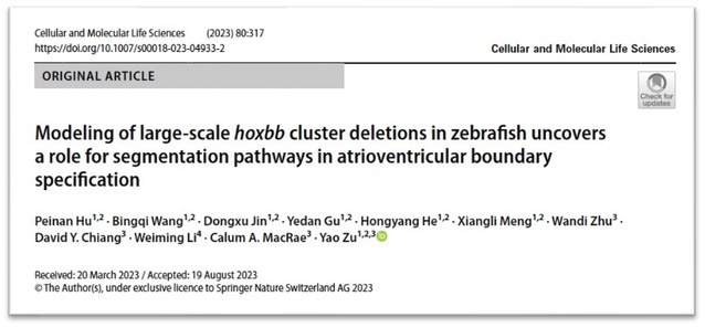 近日,葡京8883官网入口祖尧课题组,联合哈佛大学医学院研究人员在其专业领域期刊《Cellular and Molecular Life Sciences》(IF 8.7)(doi:10.1007/s00018-023-04933-2)发表题为《Modeling of large-scale hoxbb cluster deletions in zebrafish uncovers a role for segmentation pathways in atrioventricular boundary specification》的研究论文,针对HOXB 缺失突变导致的疾病及其靶点基因调控机制展开研究并取得进展,为后续靶向药物筛选提供理论支持。