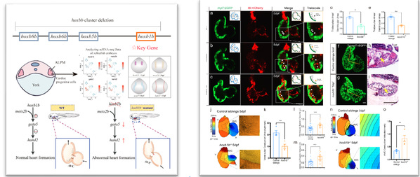 Hox基因家族是身体前后体轴调控的重要基因,相关Hox基因的缺失会导致严重的疾病,但其在心脏发育中的调控机制尚不清楚。祖尧课题组利用斑马鱼模拟人类疾病构建模型,借助CRISPR基因编辑技术成功得到了具备致病表型的大片段缺失的斑马鱼同源 hoxbb 簇的突变体,并利用单细胞测序数据分析、原位杂交和电生理等相关技术手段发现缺失片段中的hoxb1b是关键基因靶点,hoxb1b通过与meis2b相互结合,激活下游基因gata5并抑制hand2的表达,进而调节心脏瓣膜的形成。该研究建立了高效的基因编辑大片段删除技术、基因编辑挖掘关键基因靶点的方法,同时揭示了hoxbb调控心脏发育的分子机制及其致病机理。