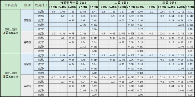 学院认定 的 C 类赛 事 | 国家级 | 成员 1 | 1.0 | 0.7 | 0.65 | 0.62 | 0.60 | 0.75 | 0.525 | 0.4875 | 0.465 | 0.45 | 0.5 | 0.35 | 0.325 | 0.31 | 0.30 |