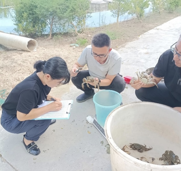 (王军在开展中华绒螯蟹选育工作,左起第二位)